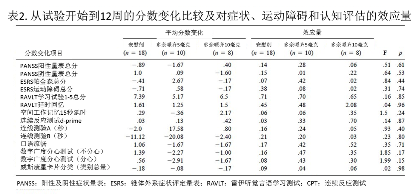 鑒于一些文獻(xiàn)資料有證據(jù)表明類膽堿藥物可能對(duì)精神分裂癥癥狀(Edelstein等人,1981)和錐體外系癥狀(Caroff等人,2001)有治療效果,有研究對(duì)多奈哌齊在這些癥狀領(lǐng)域的治療效果也進(jìn)行了探索和分析。多奈哌齊5毫克和10毫克治療與安慰劑治療相比,在PANSS陽(yáng)性癥狀(F=1.74,df=101,p=.18)和陰性癥狀(F=.38,df=100,p=.68)的轉(zhuǎn)換中,并沒(méi)有顯著差異。另外,多奈哌齊治療和安慰劑治療在帕金森癥(F=.51,df=101,p=.6)與嚴(yán)重運(yùn)動(dòng)障礙(F=.01,df=101,p=.99)轉(zhuǎn)換的ESRS評(píng)定中也沒(méi)有顯著差異。在其他測(cè)試結(jié)果中也未見(jiàn)任何顯著差異(見(jiàn)表2總結(jié))。