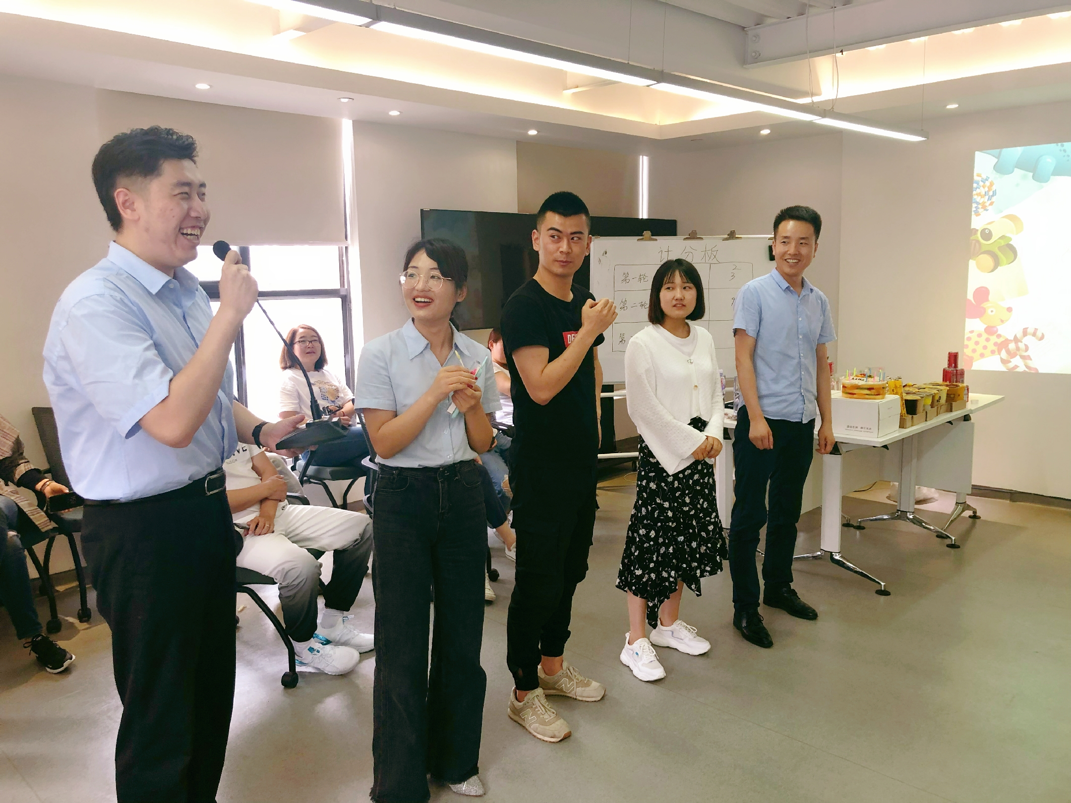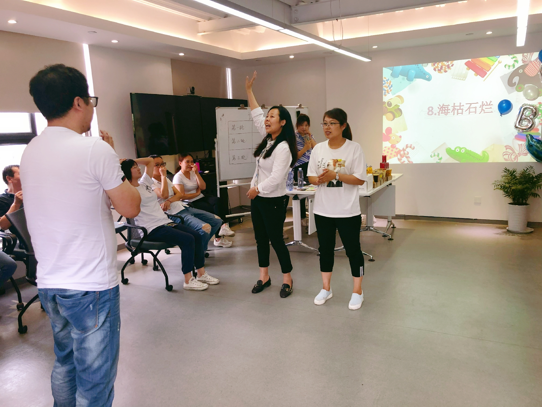 首先壽星們入場時,自由拿取棒棒糖,根據(jù)不同顏色分出兩個隊伍,進行對抗賽,通過三輪游戲比拼,獲勝隊將獲得小禮品,失利隊則集體受到小小的懲罰。