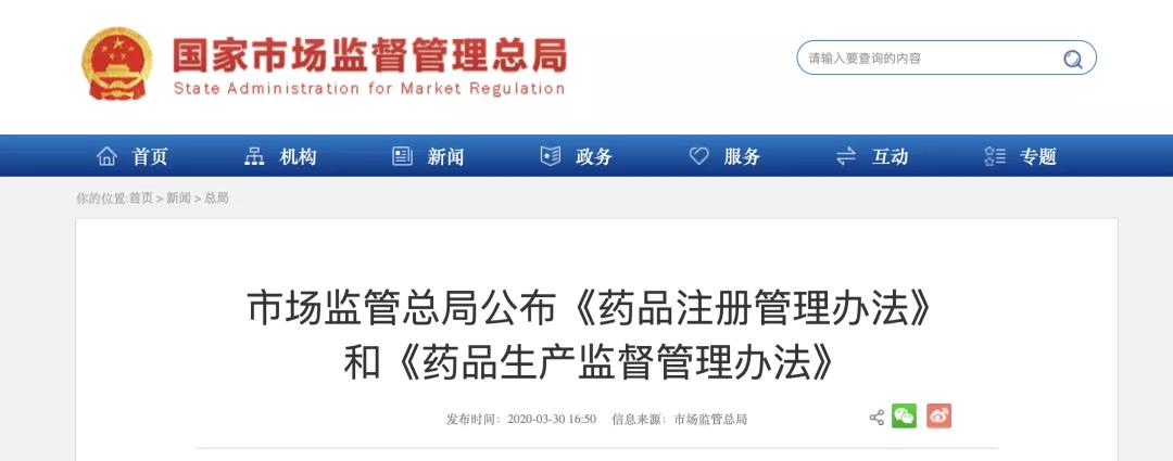今日(3月30日),市場(chǎng)監(jiān)管總局公布《藥品注冊(cè)管理辦法》和《藥品生產(chǎn)監(jiān)督管理辦法》。